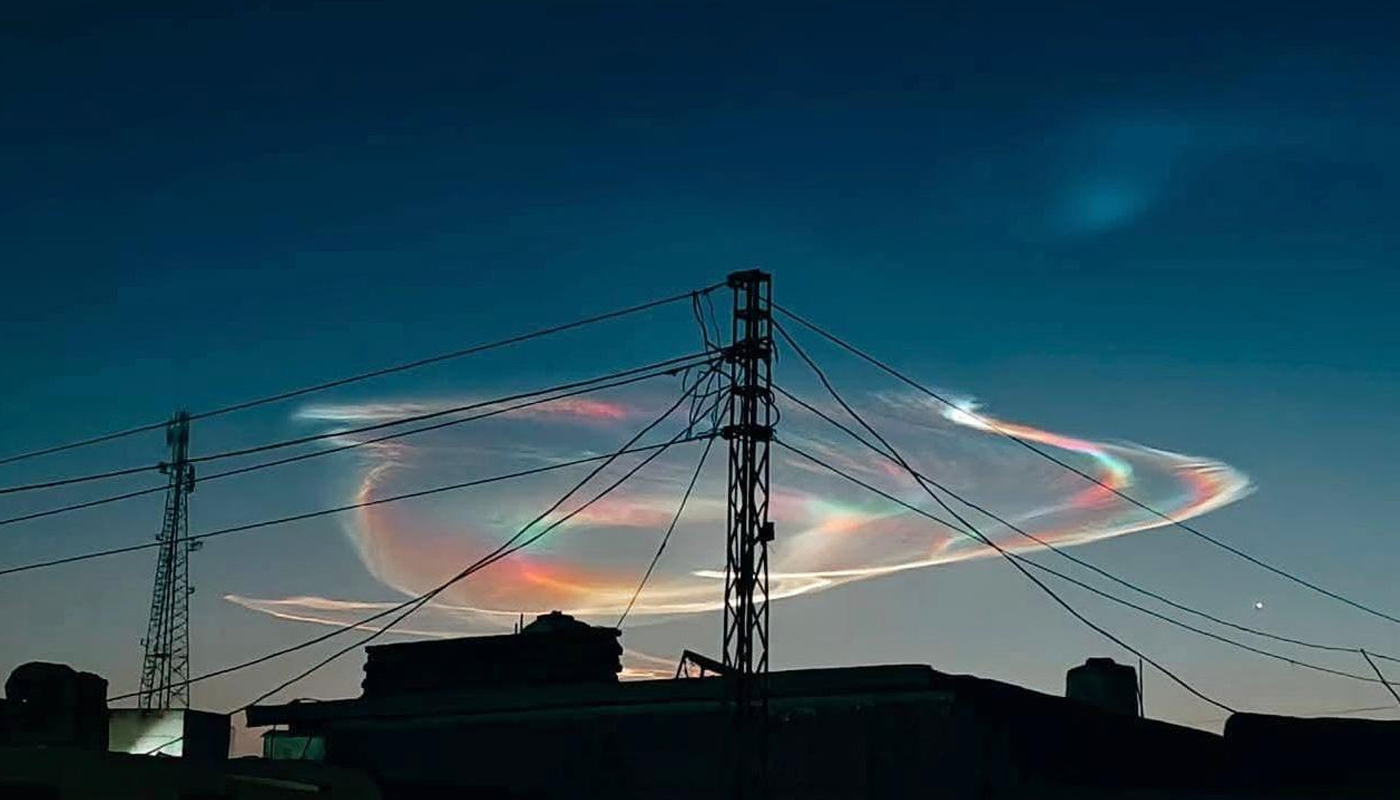 تصاویر اور ویڈیو میں نظر آرہا ہے کہ بادل پرندوں کی طرح پھیلے ہوئے ہیں، اندر سے رنگ برنگی روشنی چمک رہی ہے اور کچھ سفید دھاریاں (جیسے دُم) بھی نظر آرہی ہے۔