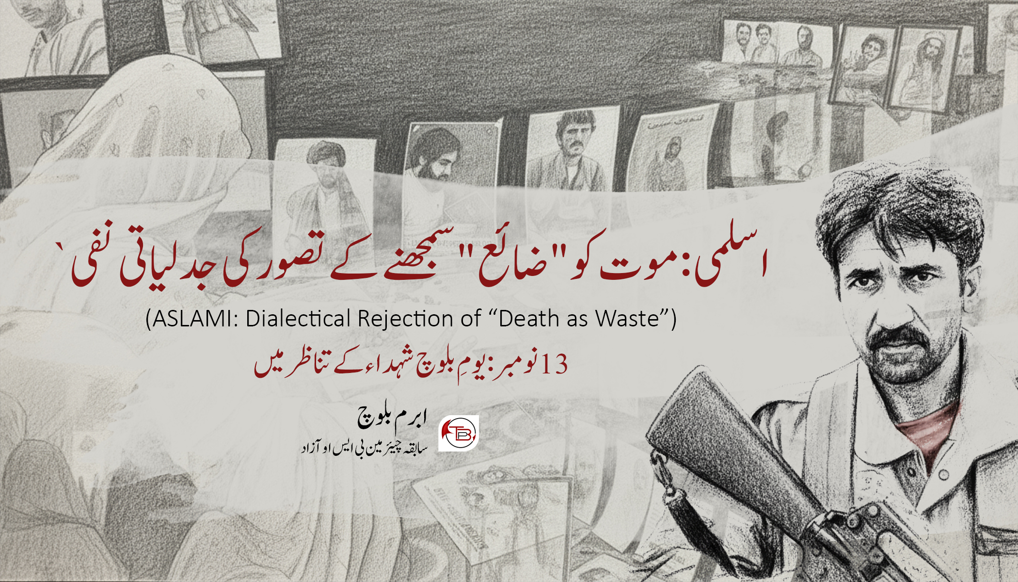 بلوچ سماج نے آغازِ قبضہ گیری ہی سے اس منطق کو اپنا فکری محور بنایا۔ آزادی کے لیے بے شمار قربانیاں دی گئیں، وہ قربانیاں جنہوں نے تحریک کو زندہ رکھا اور نسل در نسل منتقل کیا۔ طویل جدوجہد کے بعد ایک ایسا مرحلہ آیا جہاں “موت بطور ضیاع” کی نفی ایک تاریخی ناگزیرت (Historical Necessity) بن گئی۔ یہی وہ لمحہ تھا جہاں “اسلمی فیصلہ” (Aslami Decision) سامنے آیا، ایک فکری اور انقلابی موڑ جس نے قربانی کے معیار کو ایک نئی معنوی بلندی دی۔