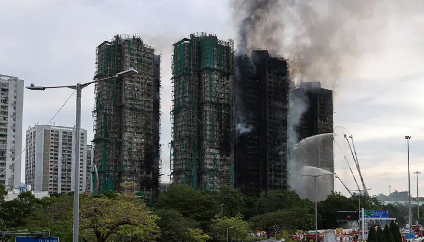 بدھ کو شدید شعلوں نے تائی پو کے شمالی ضلع میں مرمت کے مرحلے سے گزرنے والے رہائشی کمپلیکس وانگ فوک کورٹ کی متعدد عمارتوں میں بندھے بانسوں کو اپنی لپیٹ میں لے لیا۔