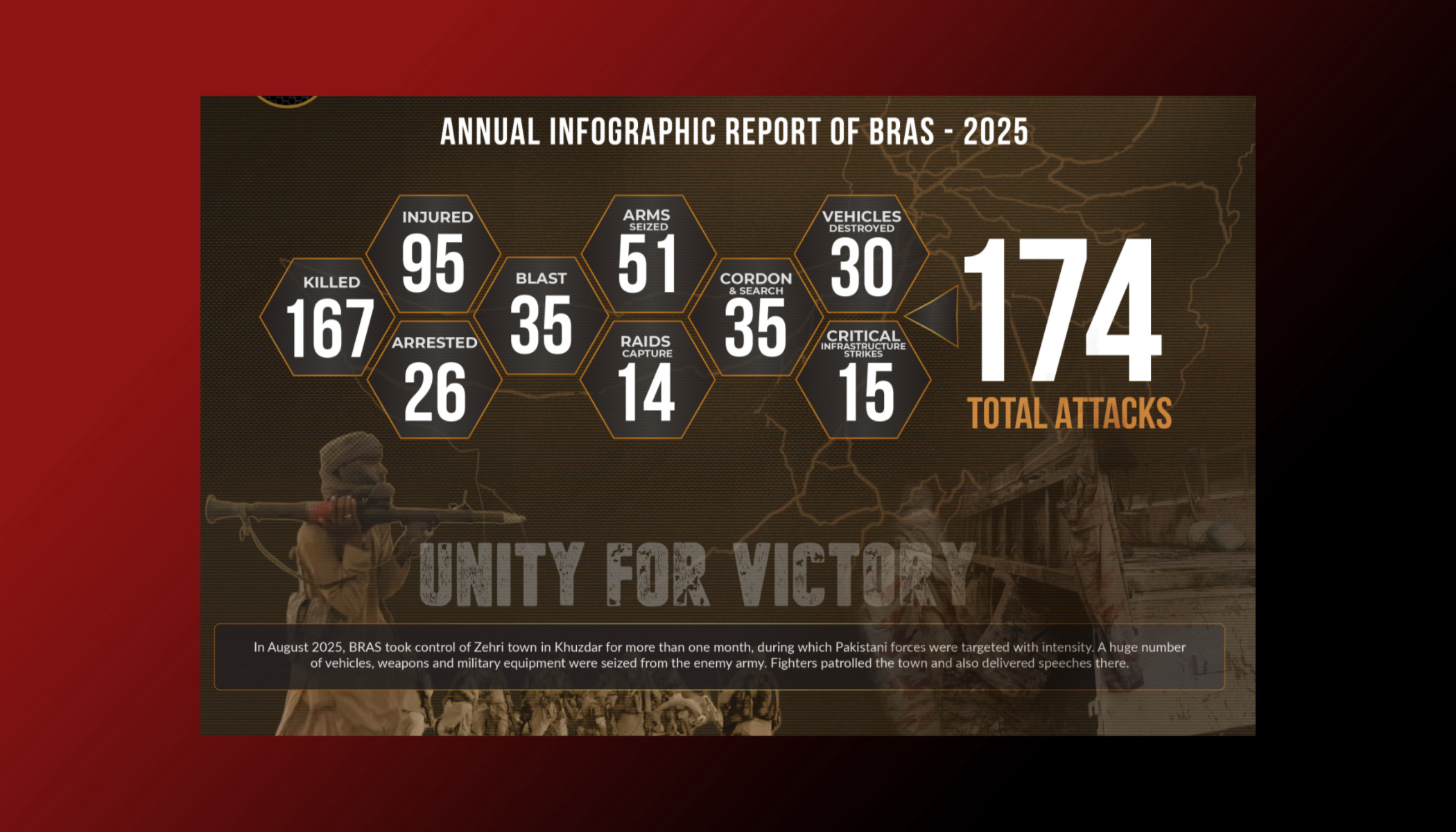 رپورٹ کے مطابق سال 2025 کے دوران براس کی جانب سے کل 174 حملے کیے گئے۔ ان کارروائیوں کے نتیجے میں 167 پاکستانی اہلکار ہلاک جبکہ 95 افراد زخمی ہوئے۔ اسی عرصے میں 26 افراد کو گرفتار کیا گیا جن میں پاکستانی خفیہ اداروں کے اہلکار شامل ہیں۔