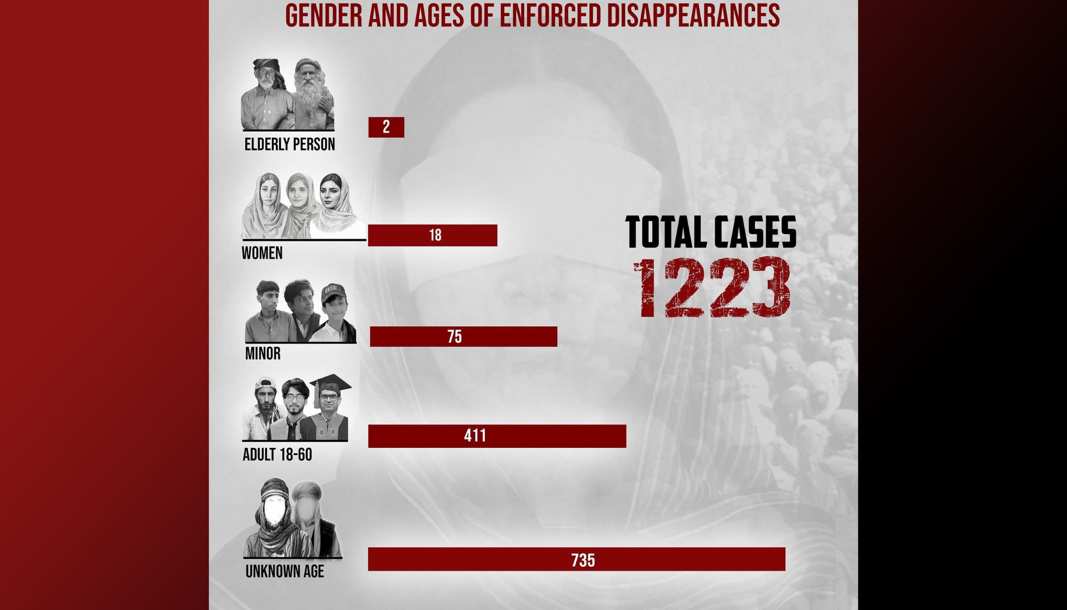 رپورٹ میں بتایا گیا ہے کہ جبری گمشدگیوں کا شکار ہونے والوں میں مختلف عمر اور سماجی طبقوں سے تعلق رکھنے والے افراد شامل ہیں۔ اعداد و شمار کے مطابق 18 سے 60 سال کے 411 بالغ افراد، 75 کم عمر بچے، 18 خواتین اور 2 بزرگ افراد جبری طور پر لاپتہ ہوئے، جبکہ 735 افراد کی عمر سے متعلق معلومات دستیاب نہیں ہو سکیں۔