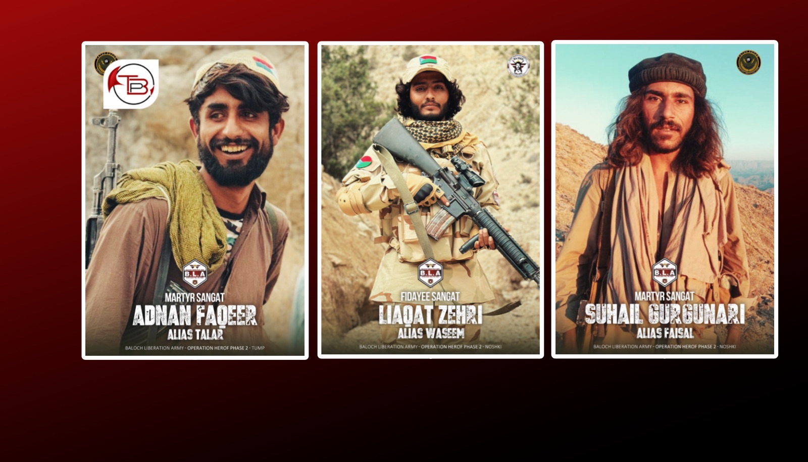 تنظیم کی جانب سے گذشتہ ماہ آپریشن ھیروف کے دوسرے مرحلے میں شامل جانبحق اور فدائین سرمچاروں کے تصاویر و تفصیلات جاری کئے جارہے ہیں، تنظیم نے مزید تین سرمچاروں کے تفصیلات شائع کئے ہیں۔