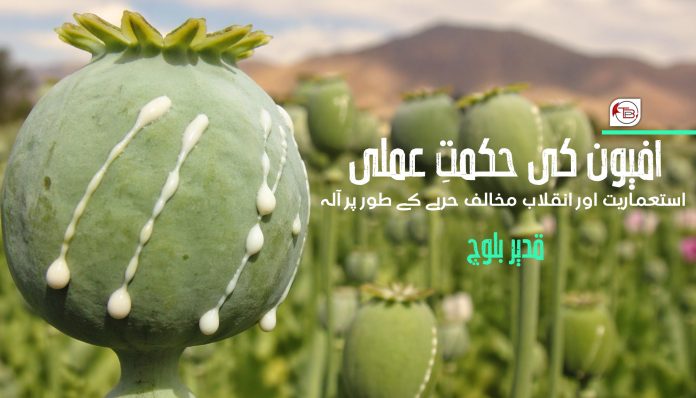 آج کے دور میں اس کی بدترین مثال بلوچستان کے علاقوں نوشکی اور چاغی کے مختلف مقامات جیسے پدگ، ژلو، شہہ سالار، امین آباد، برابچہ اور خاران کے علاقوں ایٹک، شاہوگیڑی یا واشک کے علاقہ ارماگئے میں ملتی ہے، جہاں سینکڑوں ایکڑ پر افیون کاشت کی جاتی ہے۔ بظاہر قبضہ گیر ریاست اور اس کے ادارے تو کہتے ہیں کہ ہم اس کی روک تھام کے لیے بہت کچھ کر رہے ہیں، لیکن یہ فصلیں اور ان کی بلا روک ٹوک ترسیل اسی پرانی استعماری حکمت عملی کا تسلسل معلوم ہوتی ہیں جو سرحدی علاقوں کو سیاسی شعور سے محروم رکھنے کے لیے استعمال کی جاتی رہی ہے۔
