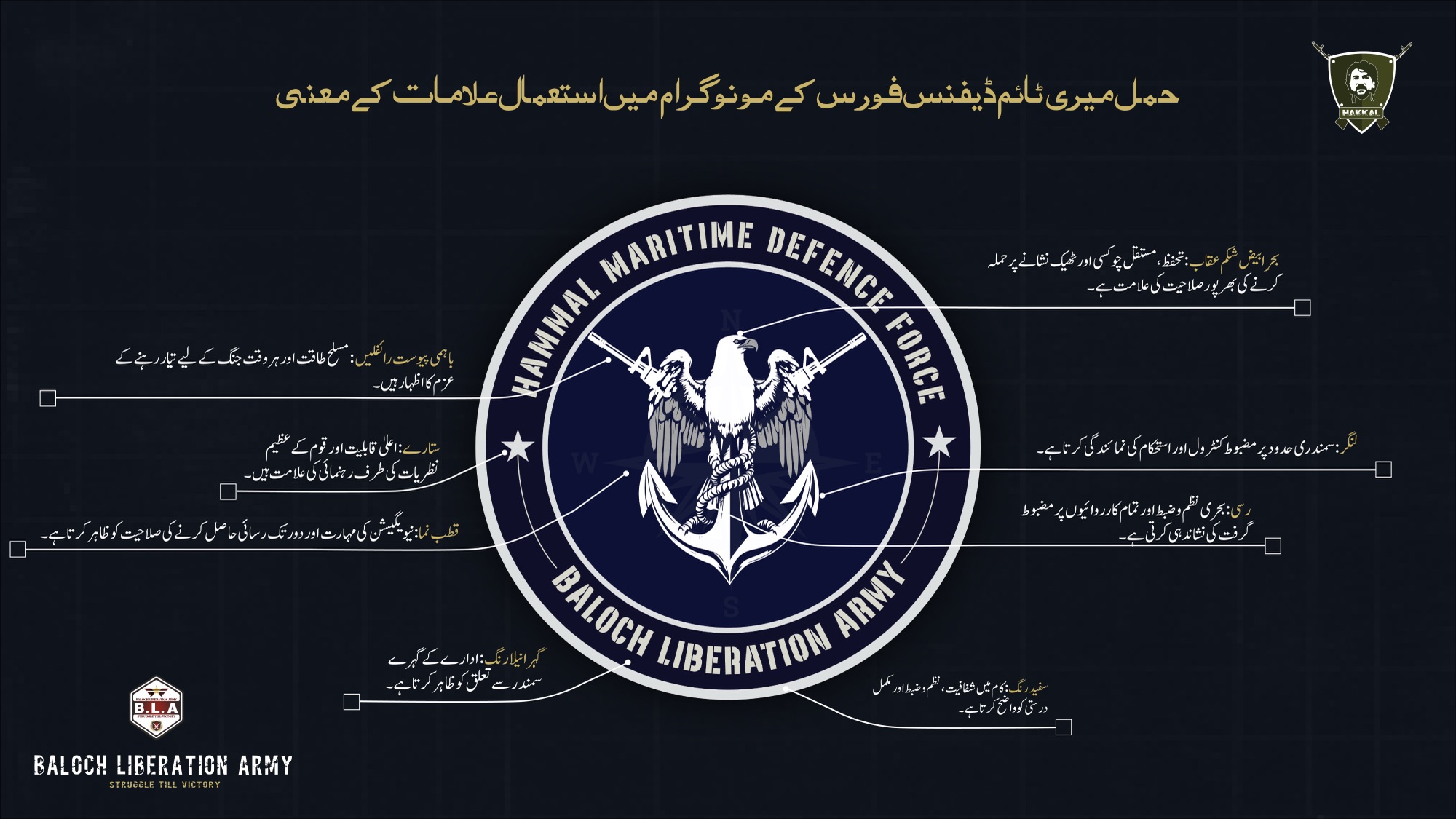 بلوچ لبریشن آرمی کے میڈیا ونگ ہکل نے تنظیم کی ذیلی بحری فورس “حمل میری ٹائم ڈیفنس فورس” کا لوگو جاری کرتے ہوئے کہا ہے کہ اس (ایمبلم) میں شامل ہر عنصر تنظیم کی پیشہ ورانہ صلاحیت، عسکری تیاری اور سمندری دفاع سے وابستگی کی عکاسی کرتا ہے۔ اس نشان کے مختلف اجزاء اور رنگ گہرے معنوں کے حامل ہیں، جو ادارے کے وژن اور ذمہ داریوں کو واضح کرتے ہیں۔