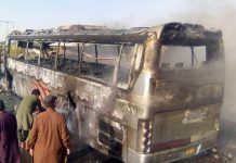بلوچستان کے علاقے حب میں وندر کے قریب مسافر کوچ اور ٹرالر کے درمیان تصادم کے بعد کوچ میں آگ لگ گئی۔